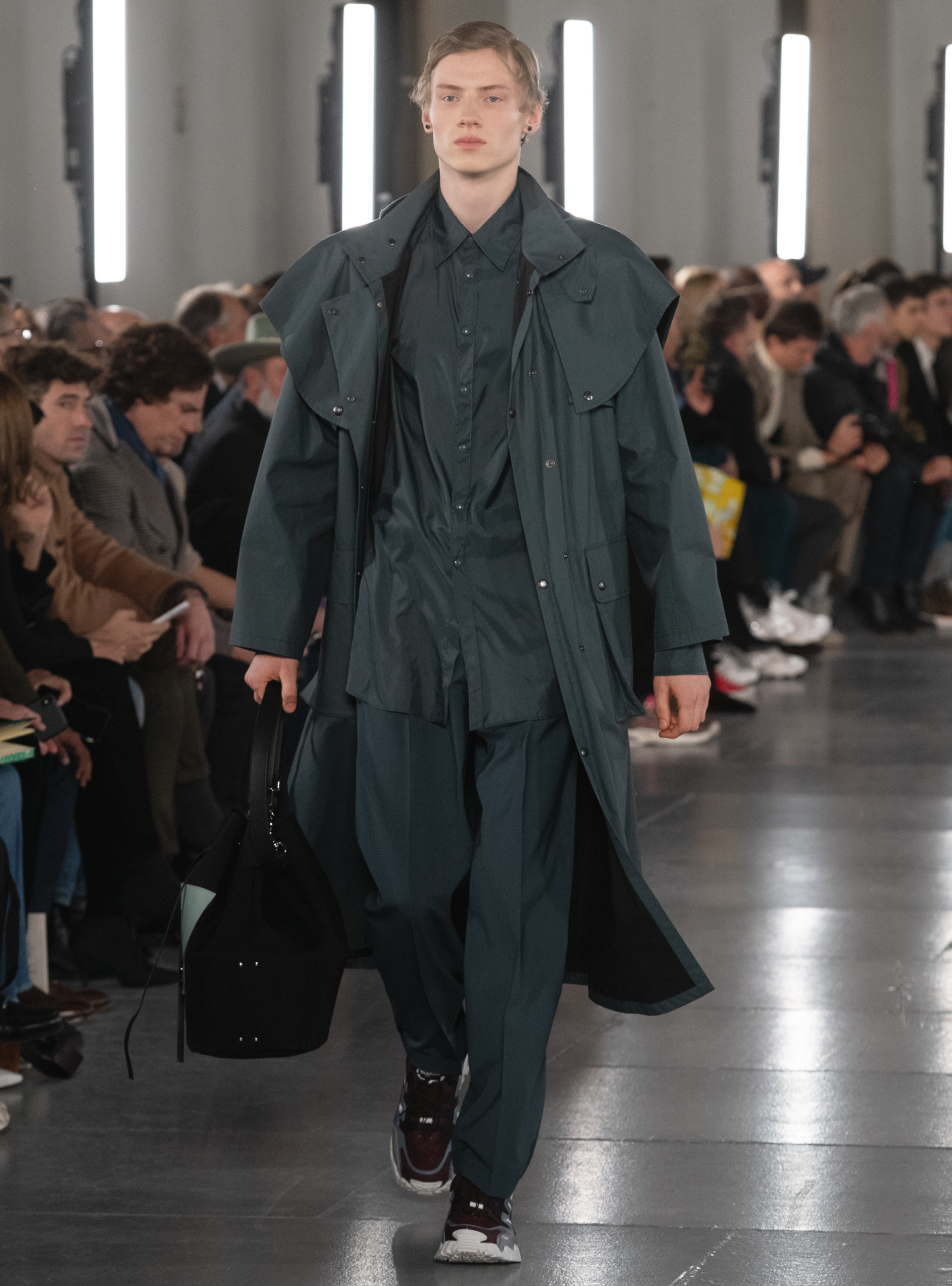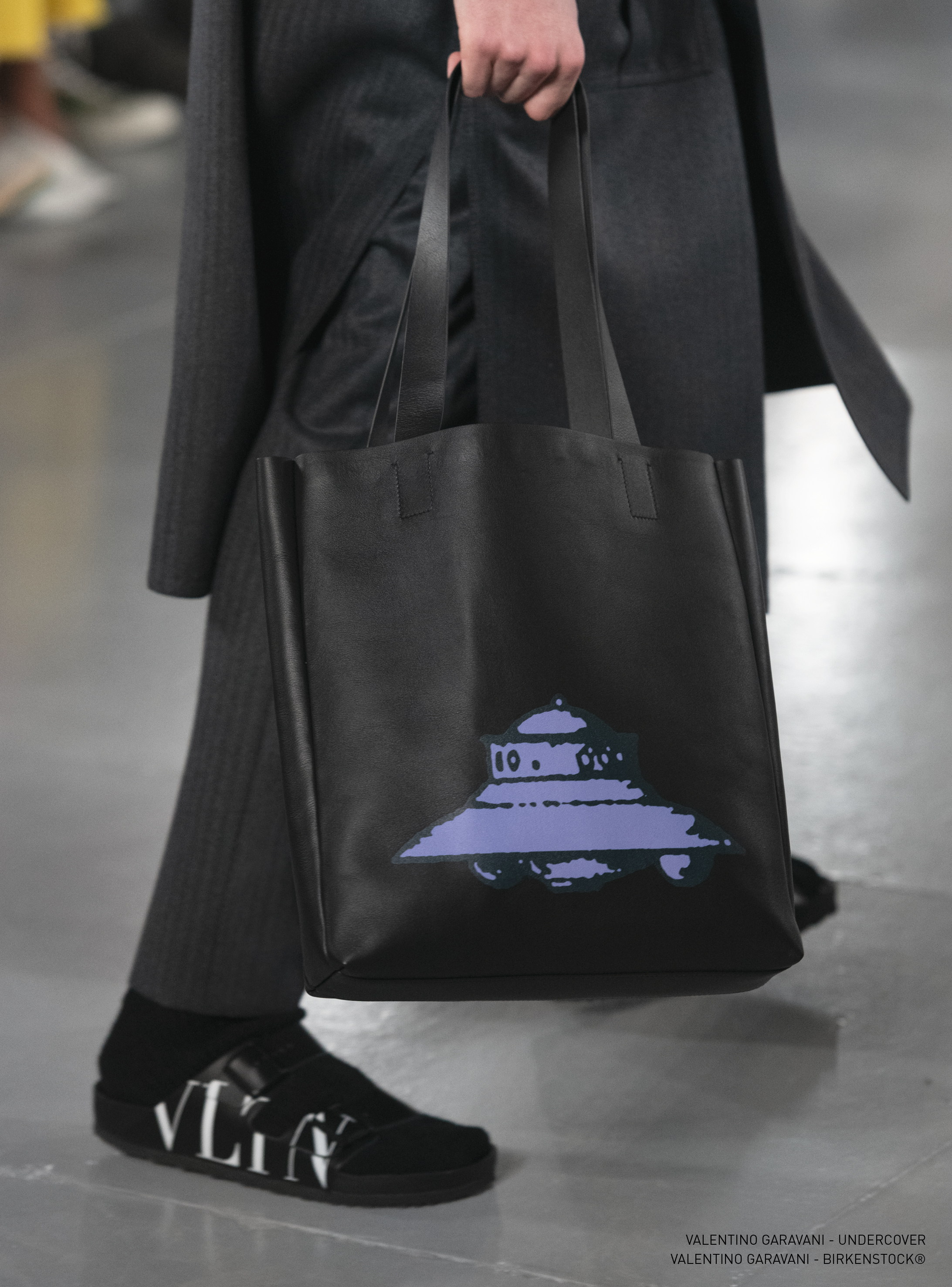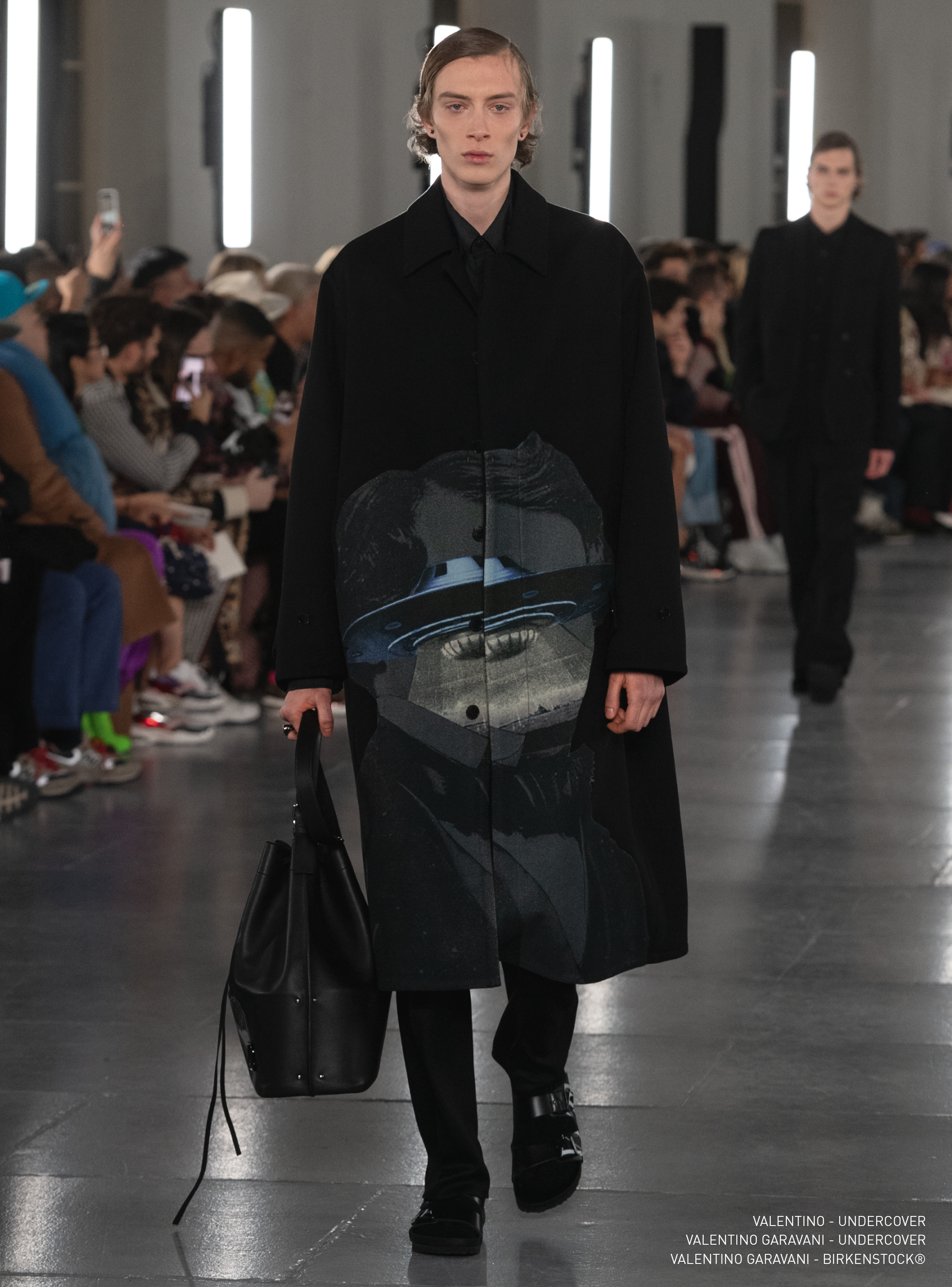 Individual pieces were broken down, eased and re-calibrated in monochrome. There was graceful suiting; sleeveless wool jackets worn over coats. Lightly padded raincoats. A longer line on shirting worn underneath double breasted jackets. Rich wool coats with long, scarf collars. Standout were the space-age graphics designed in collaboration with Jun Takahashi of Undercover. His collages, featuring space ships, portraits of Ludwig van Beethoven in the film A Clockwork Orange, flying saucers and lunar landscapes, were used as intarsias, embroideries, jacquards and prints. The season’s standout coat will most likely be a round-shouldered mohair style, covered with Takahashi’s floating, sky-blue spaceships.