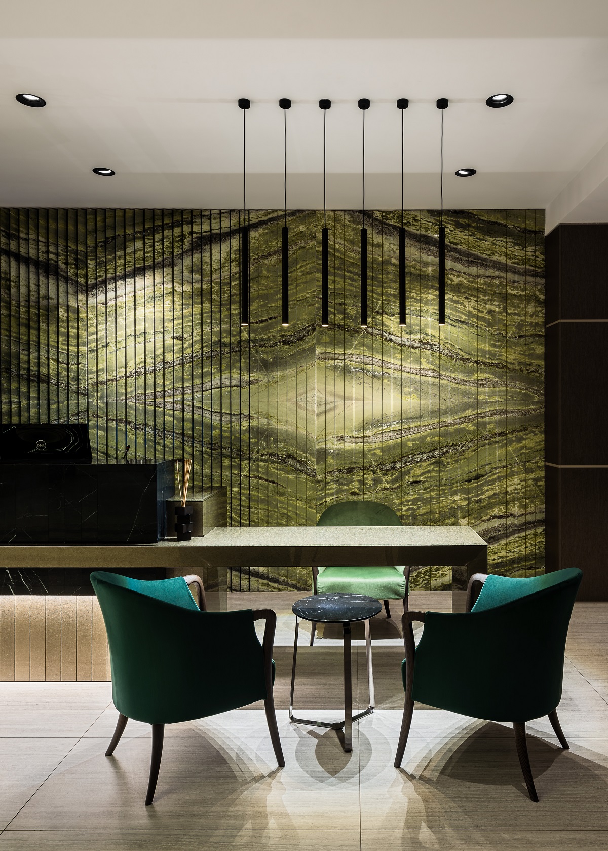 The Baton_P suspensions give the reception character: simple and refined at the same time, they combine efficient lighting of the worktop with a smart atmosphere. For the lounge area, Loro_RJ has been specially designed for false ceilings with little space, a problem solved with the curved rear heat sink that reduces the flush-mounting depth.