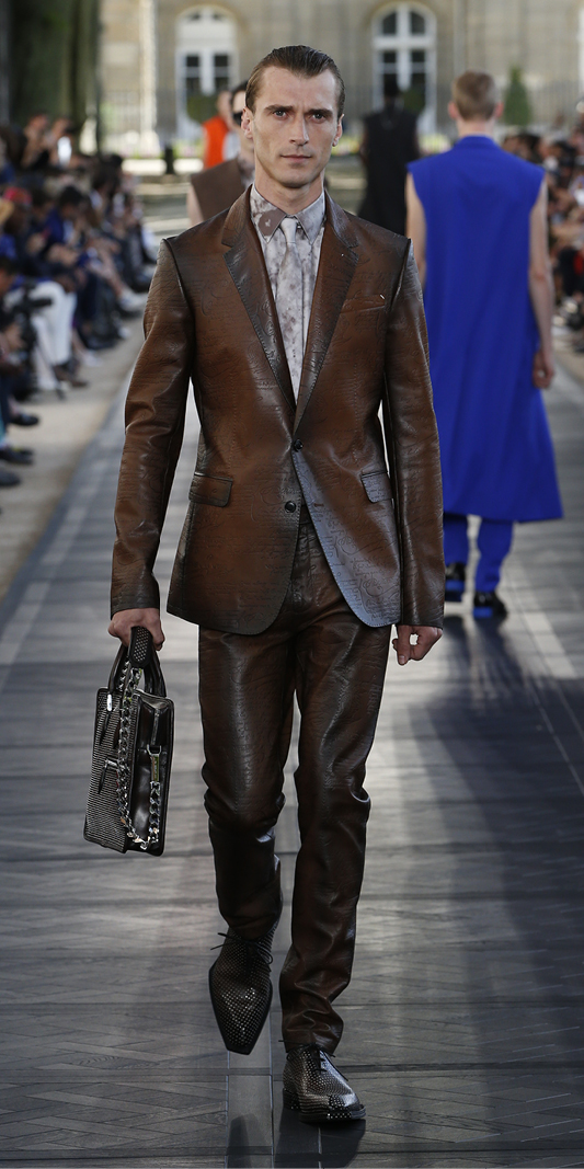 The patina suit; transmuted from the classic Alessandro shoe – is embossed with the maison’s heritage scritto motif. A largely indecipherable 19th century manuscript sacred to the Berluti archive, its handwritten letters find new life on leather tailoring, evoking the idea of archive pieces that never existed. The scritto reappears in jacquards of suits and shirts, features in the form of shadow writing on pin-striped tailoring , as a print on sportswear, on bags, and throughout the details of linings and zips.