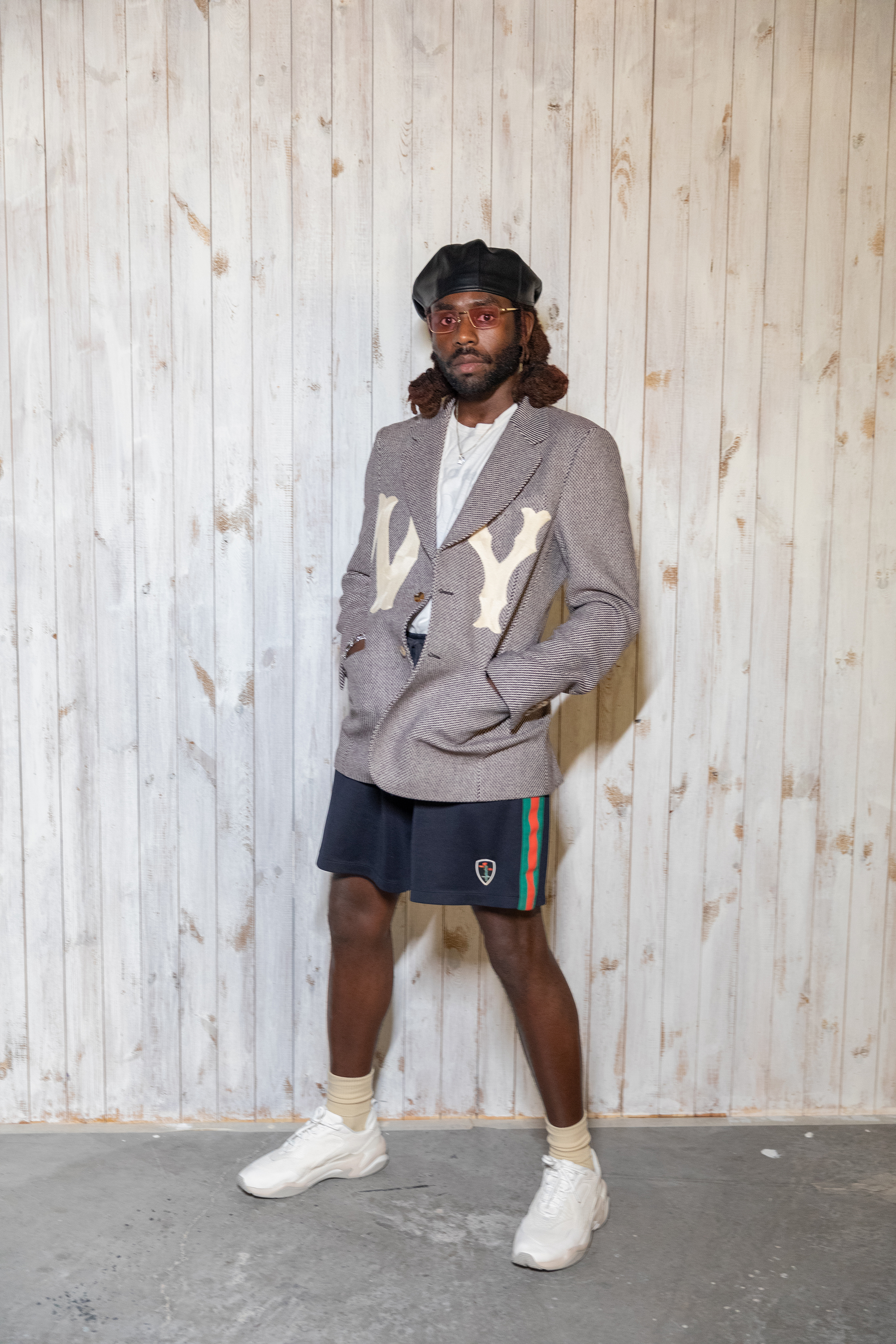 Dev Hynes wore Gucci Fall Winter 2018 look 3 bordeaux, ivory and black two button notch lapel jacket with NY Yankees™ patch and black shorts with white piping and red grosgrain stripe down the sides