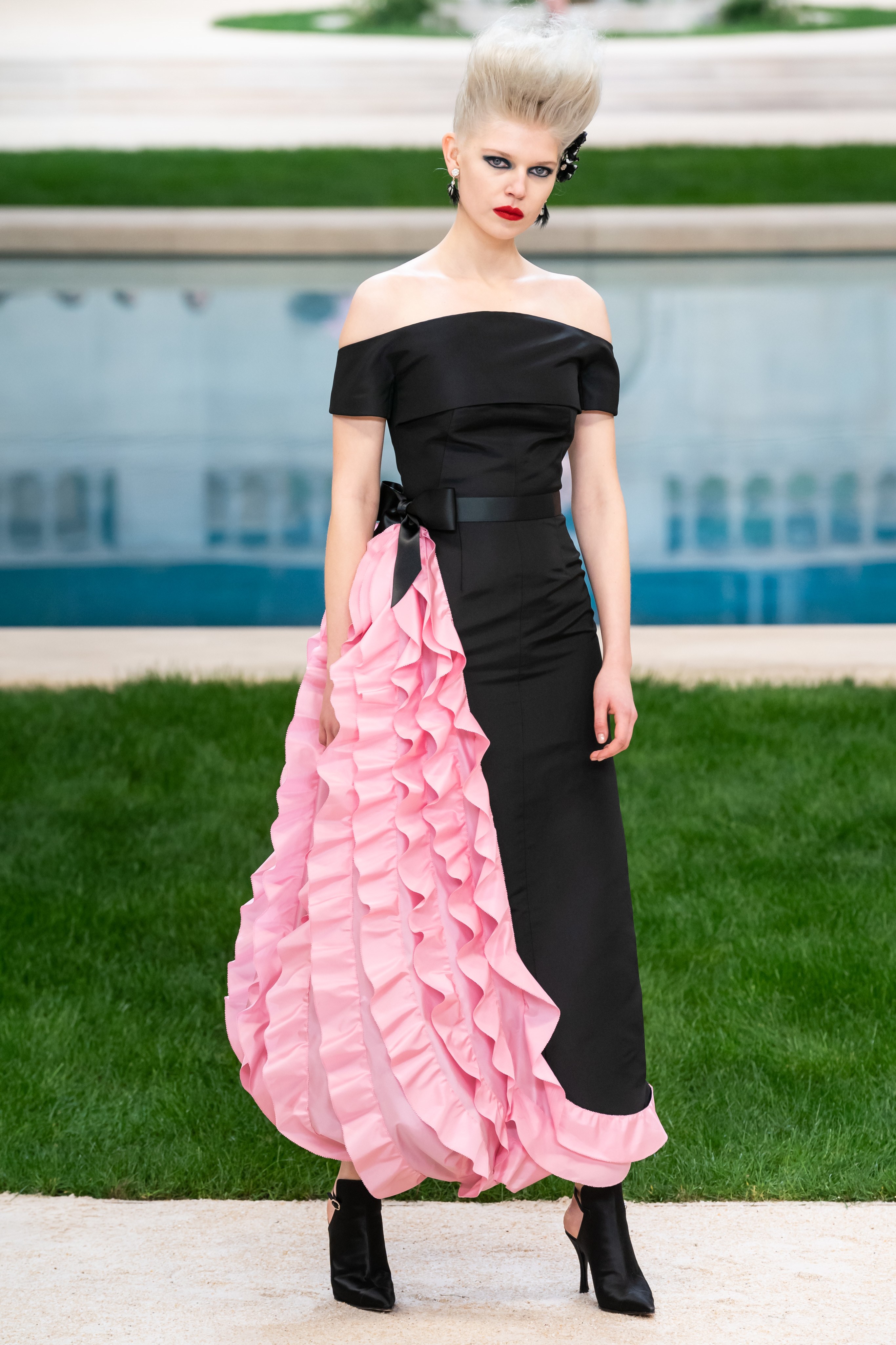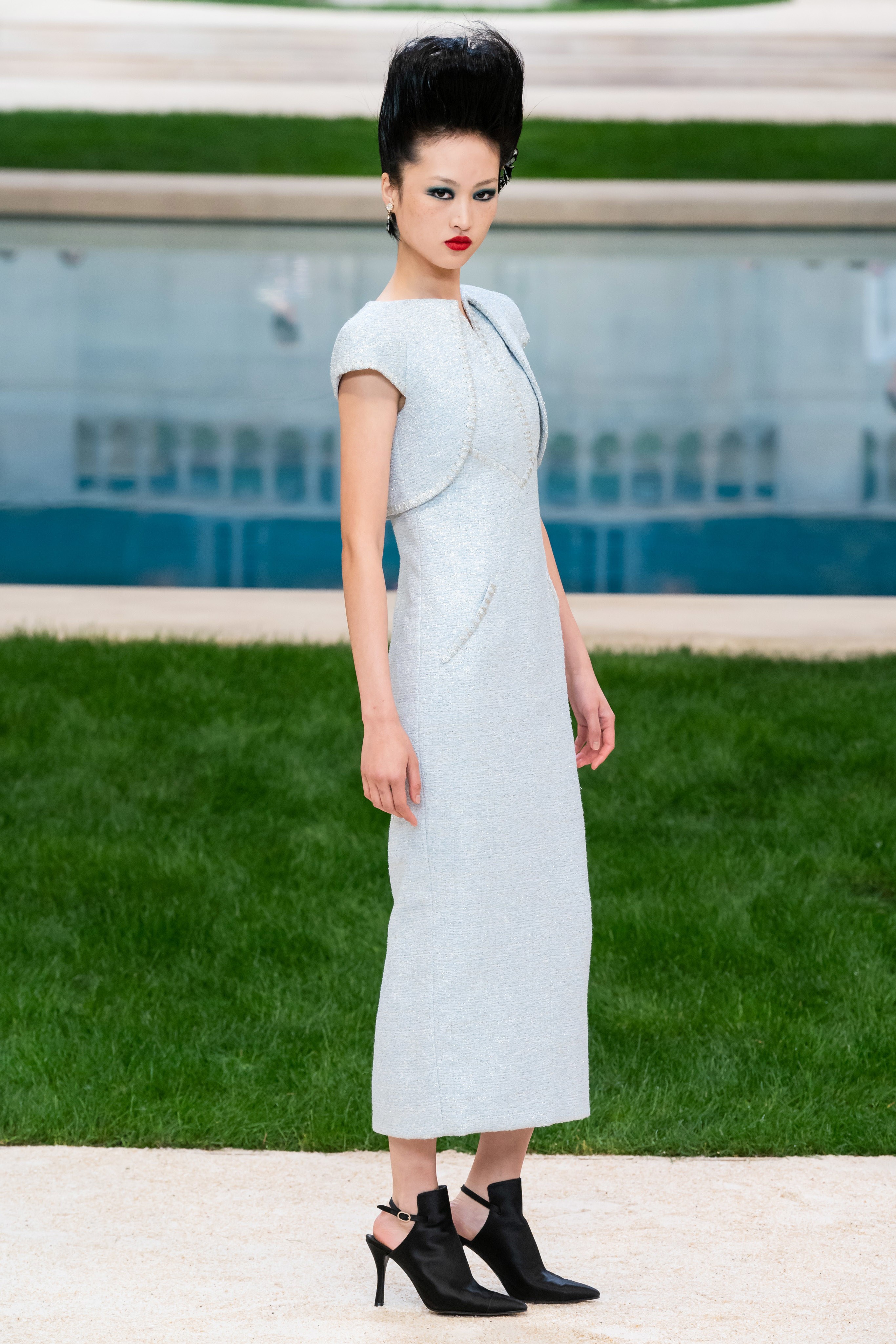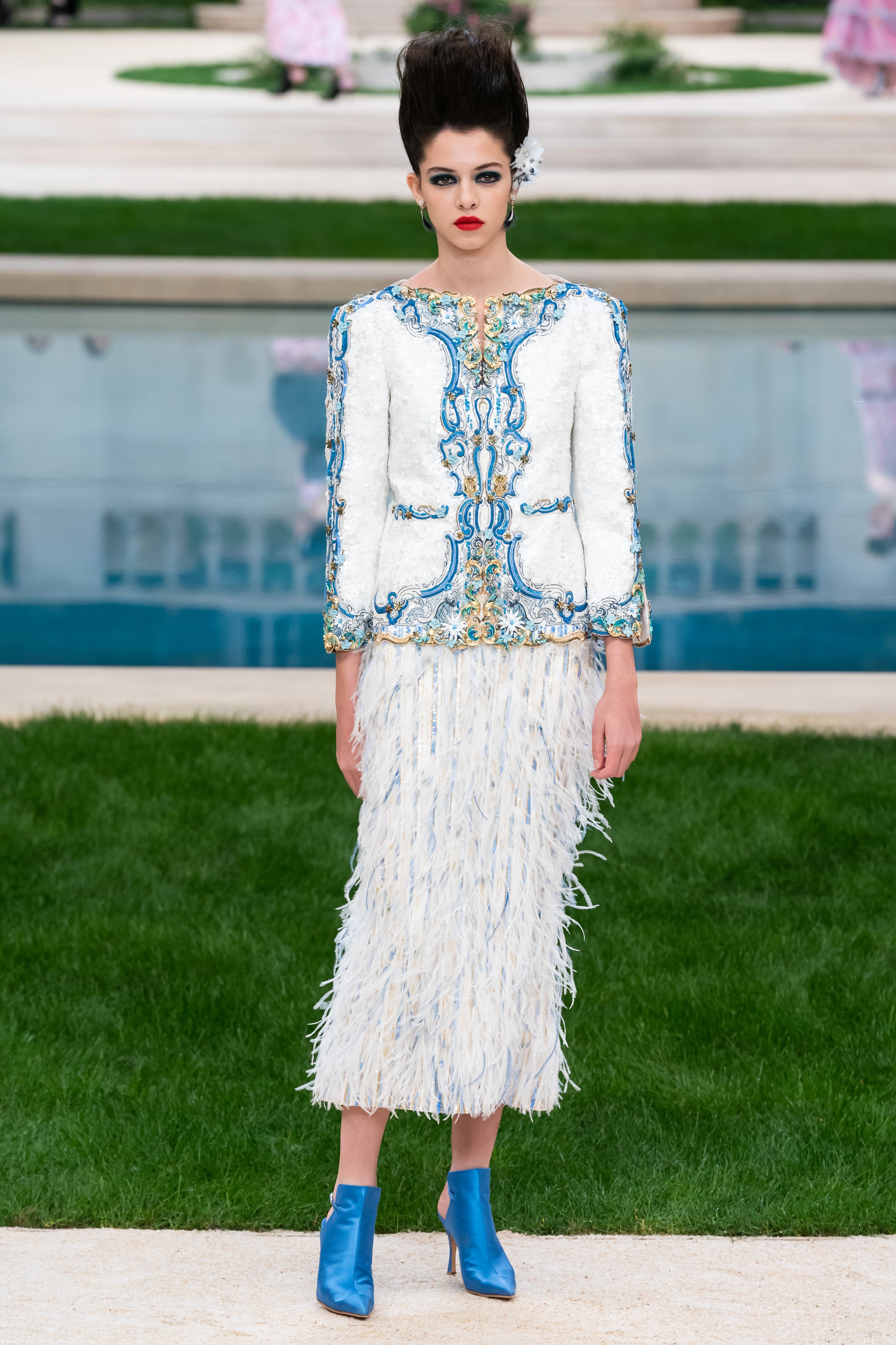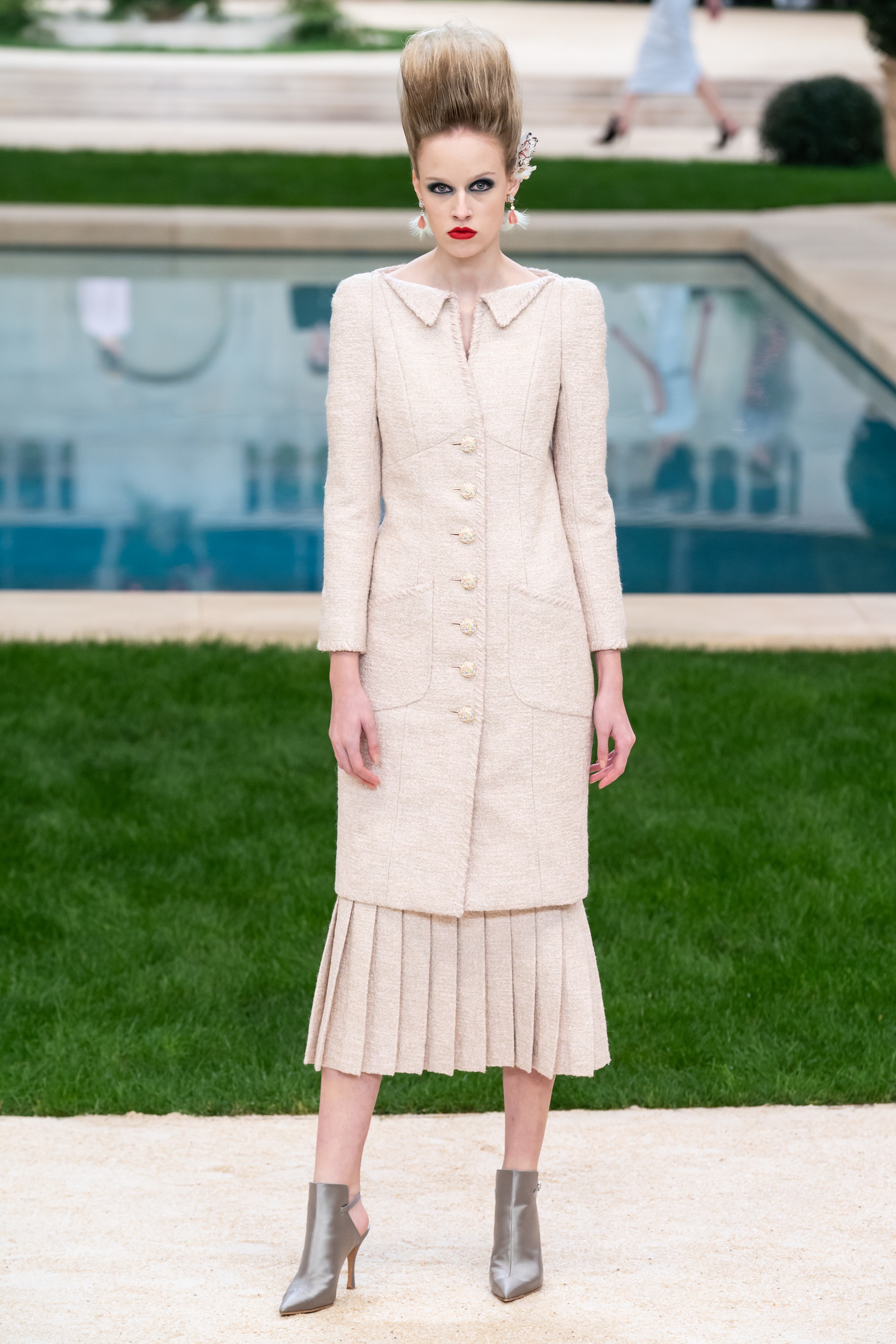 Chanel presented its couture spring 2019 collection, in the surroundings of what looks like a luxurious villa, complete with a swimming pool and green trees,