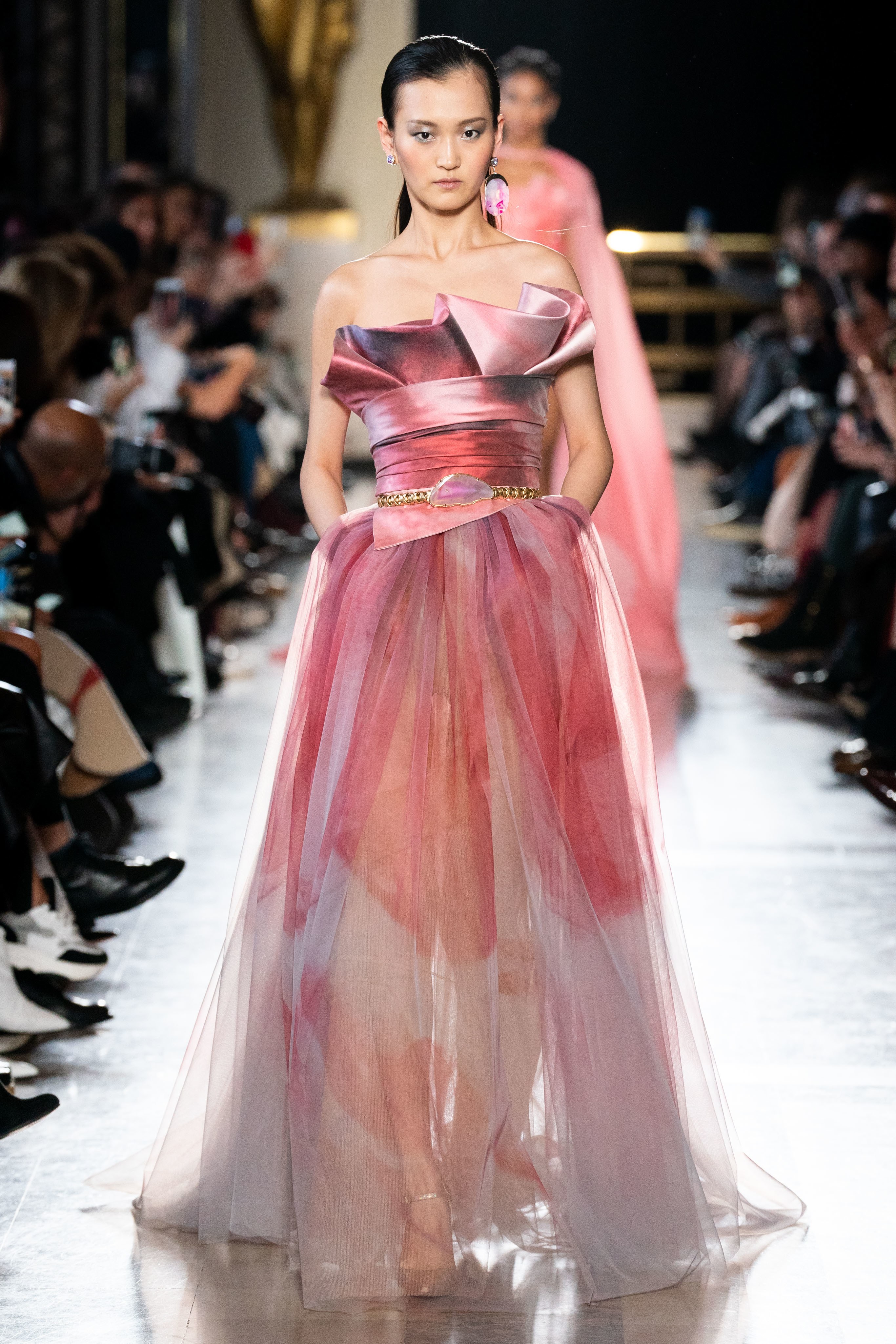Sumptuous fabrics, such as organza, tulle, satin duchesse and iridescent tafta, are layered to take on the shapes of the ripples and the symmetry of corals, the organic architectural creases of seashells, the flowy movements of anemones and their feather-like softness that sways in the currents.