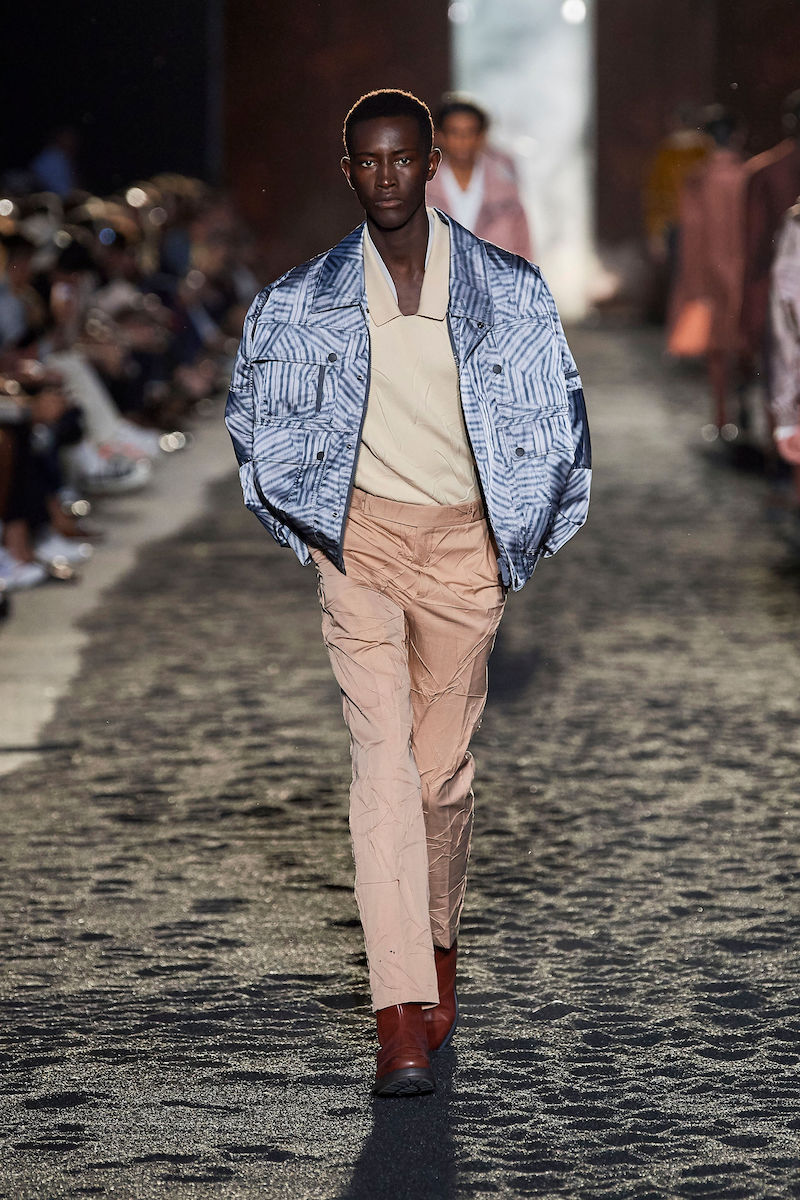 Generous pockets migrate from the sportier items onto tailored ones while tailored details move to sport pieces, suggesting a mix of categories that expands the possibilities of use. Knits are building blocks that increase the modularity of modern dressing. Firm yet extremely light fabrics – wools, technical silks, – enhance the precision of the lines and the weightlessness of the sartorial construction, with flattened crinkles, photoprints of graphic assemblages and progressive stripe patterns giving rhythm to the surfaces. Macro chiné motifs have a painterly feel, mineral dyes add depth to denim.