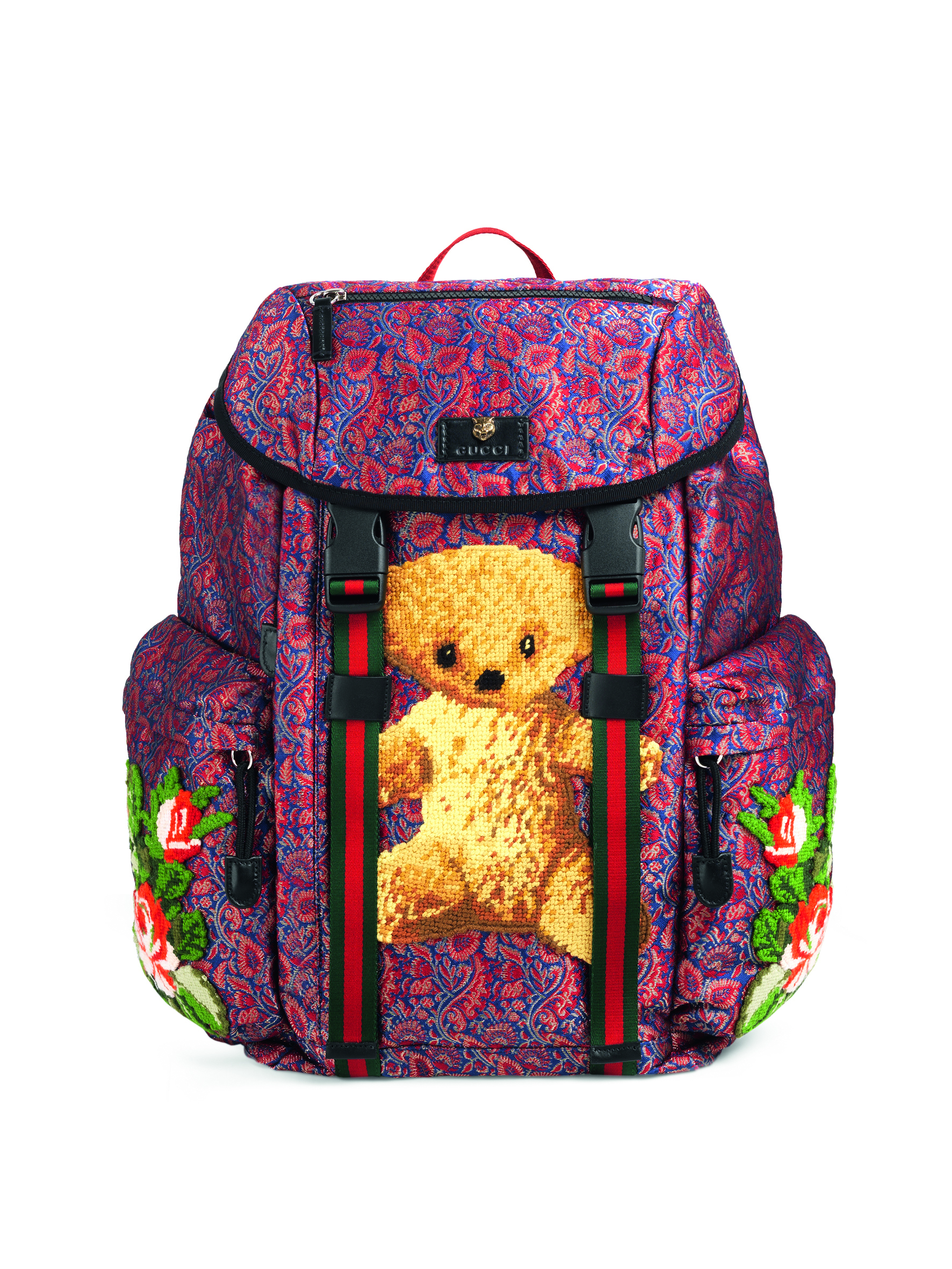 For Gucci Garden, special versions of the Dionysus handbag have also been developed and there are two new styles: one with the Eye and Stars design in three colours – white, pink and black– and another with a laurel crown motif and a pattern composed of bees, in pink, red and blue. As well as the handbags, there is also a sporty range of brightly patterned backpacks that combine practicality and style.