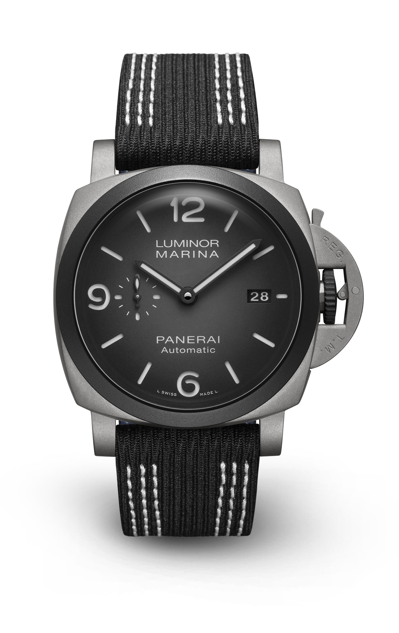 STRAP: Recycled PET, black with white stitching and trapezoidal pin buckle in titanium with DLC coating. Additional white rubber strap with luminescent “Officine Panerai” personalization.
