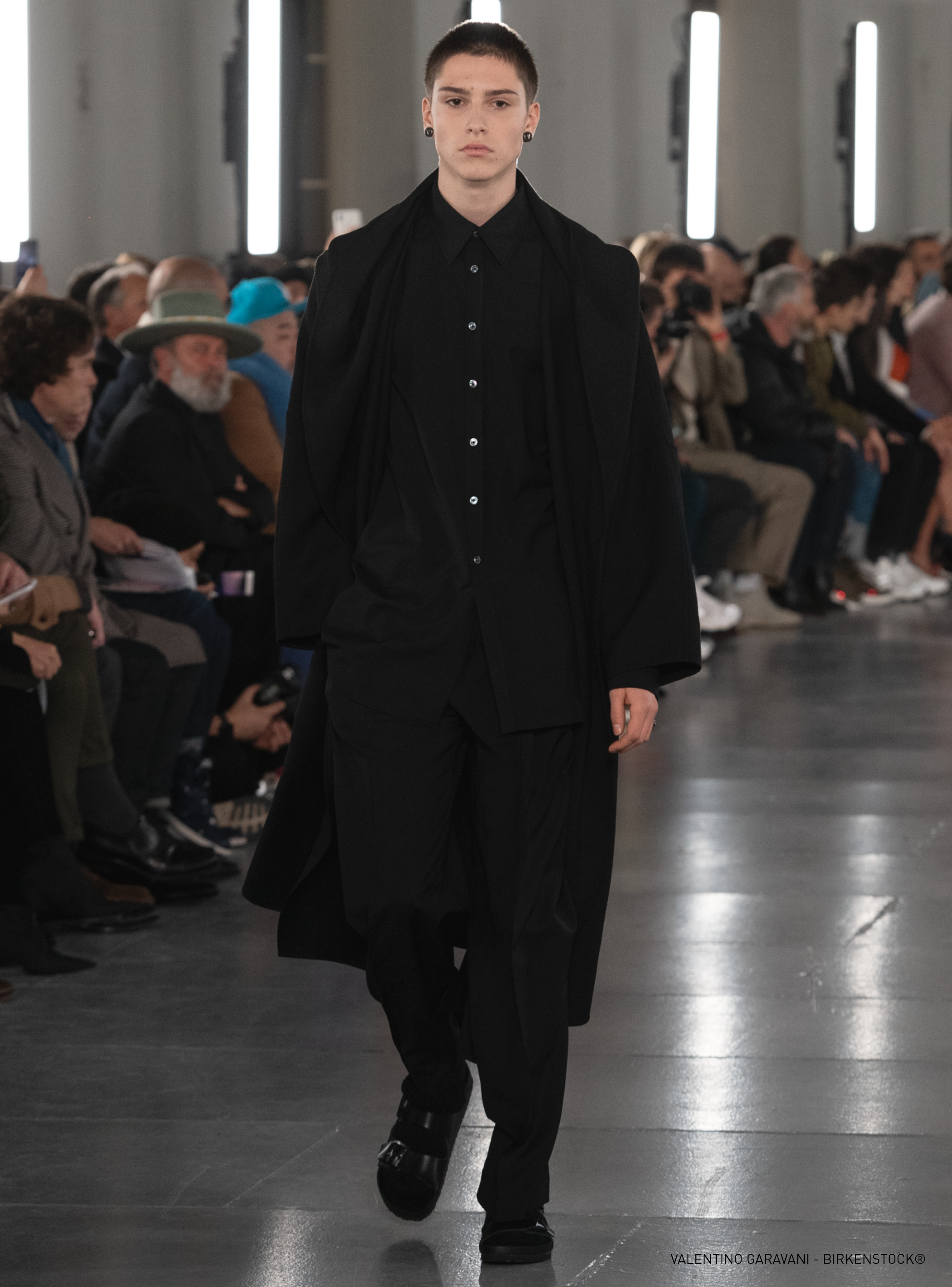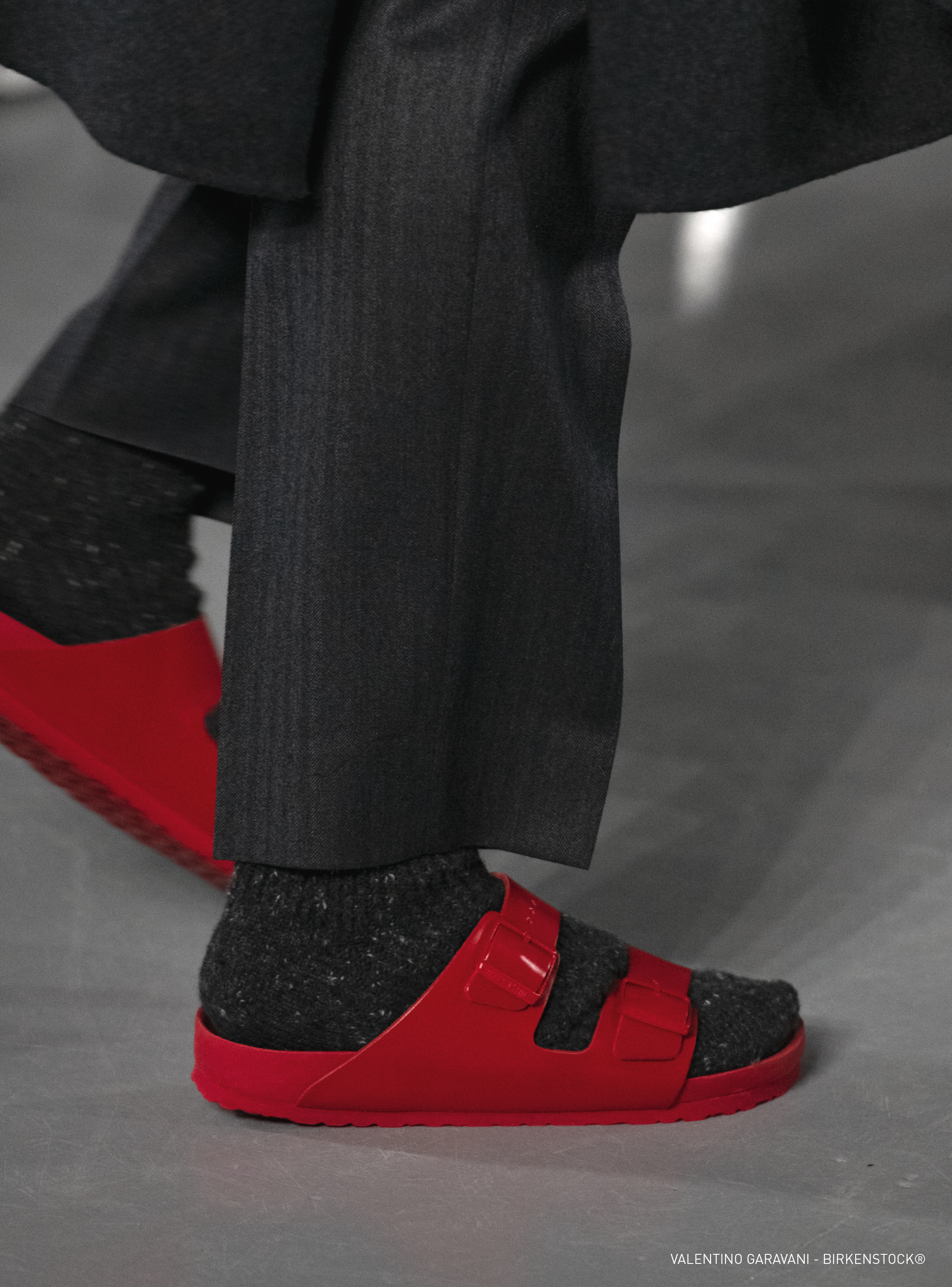 For the coming season Piccioli collaborated with the eminent healthy footwear brand Birkenstock on two exclusive styles. Their classic Arizona sandals were shown in Valentino red with tonal buckles and a tonal full leather covered footbed. And in total black with the omnipresent VLTN logo writ large on the side in white.
