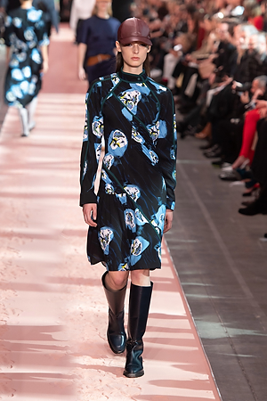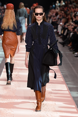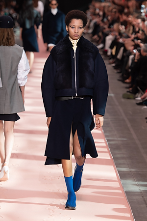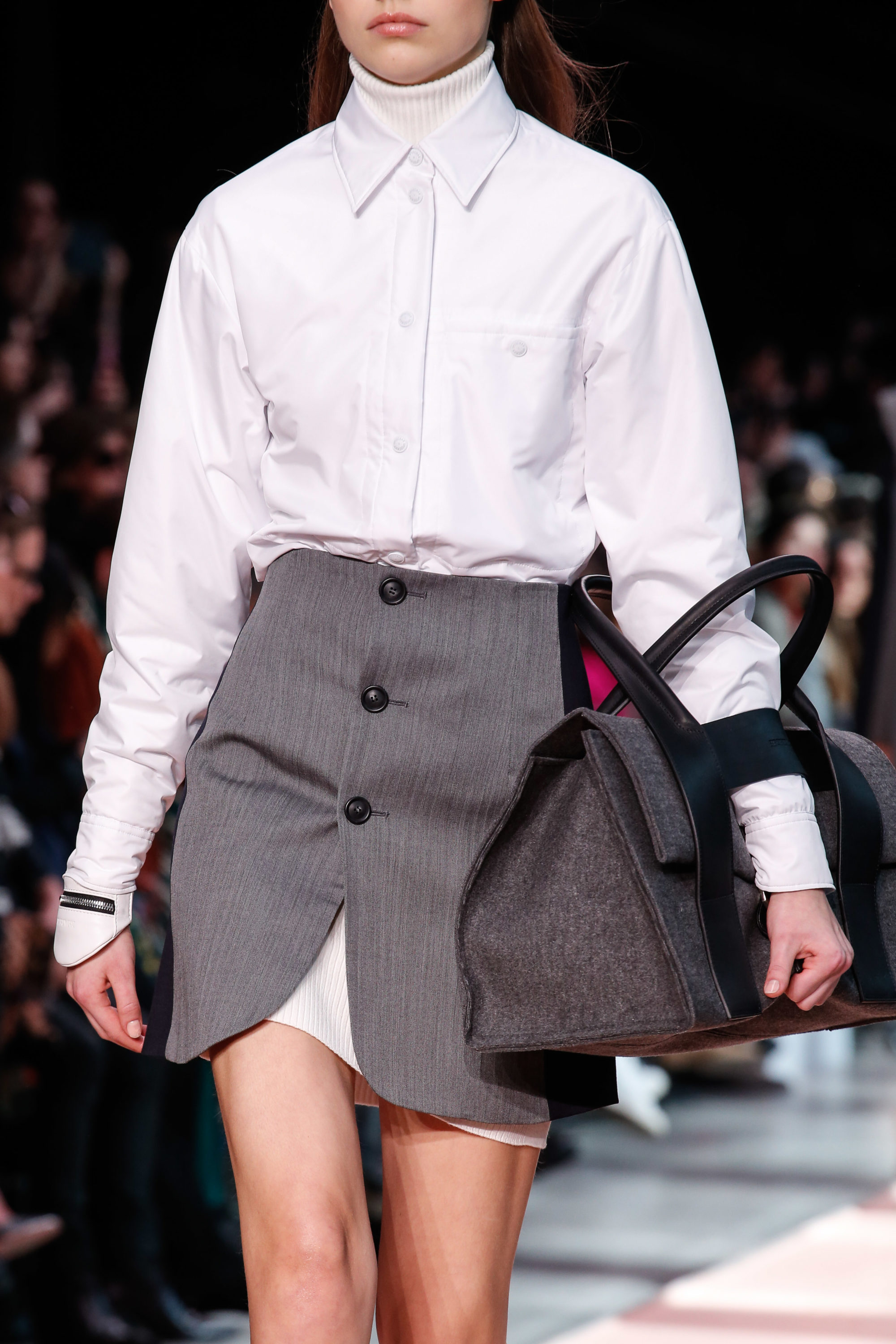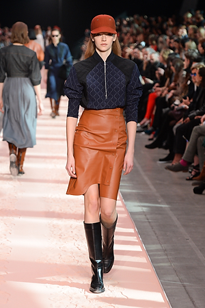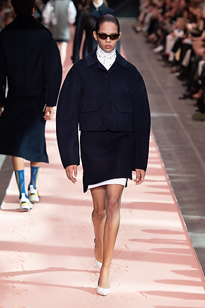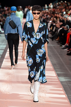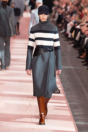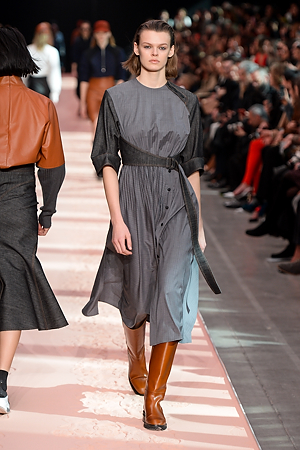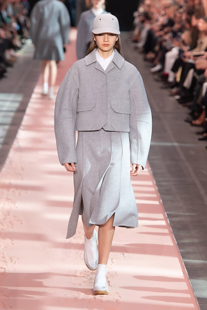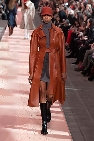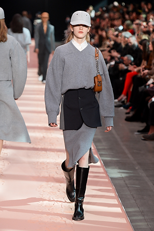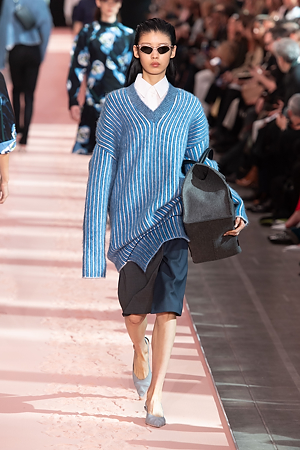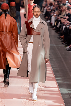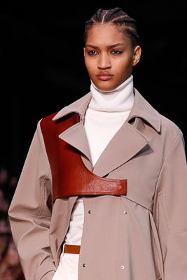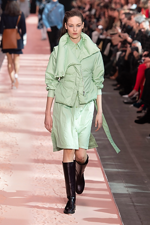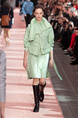 The collection plays on shades of grey with sartorial-inspired fabrics, like pinstripe wool, herringbone and stripes, and delicate colours of nature, which almost announce the arrival of spring: touches of white, beige, sand, light blue and caramel. Crossing materials with one another, wool is mixed with leather to create contrasts between matte and shiny effects. Bright colours on the padded nylon garments and on the printed and patterned knitwear vibrates in stronger hues of rust and bright blue, turquoise and green.