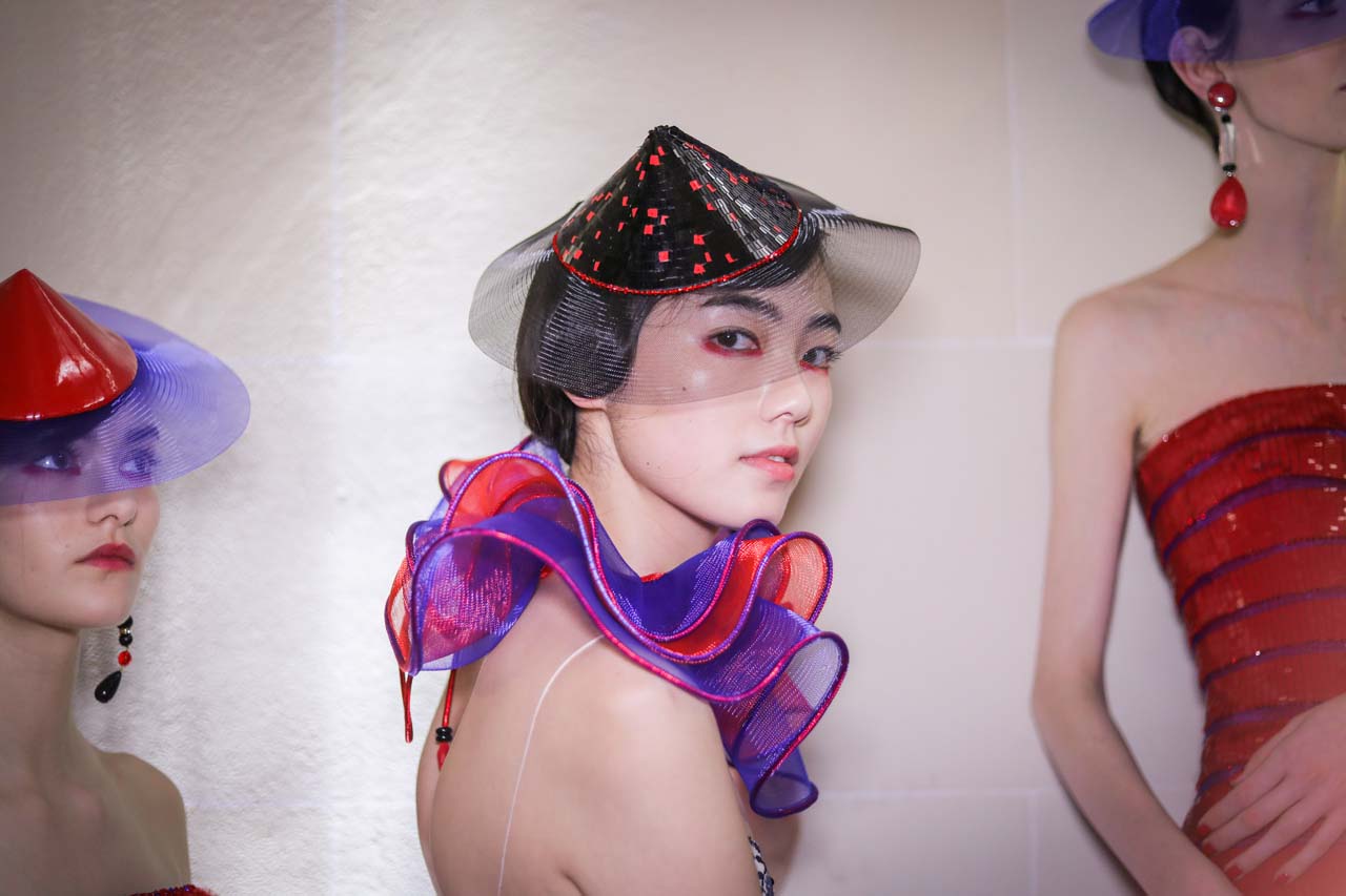 “To complement a retro-inspired collection, graphic strokes of red, applied just under the eye in a painterly fashion, give a nod to the illustrations of Erté and accent the beaded cloche hats.”