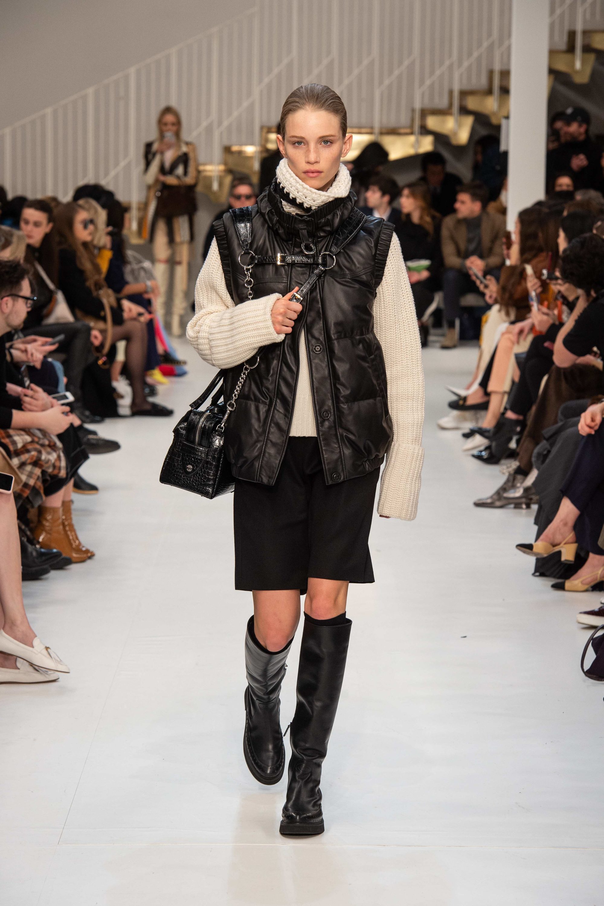 TOD’s fall winter 2019 collection revolves around leather of course, a malleable material for a style that moulds around the individual. Nappa is used for the patent trenches, immaculate blazers, graceful skirts, shirts and trousers with a crisp boyish cut. Classic pieces are made feminine by combination with chunky ribbed knits featuring mediterranean flavoured jacquards and belts cinching volume in at the waist, tweaking even the duvets, which in the sleeveless version become a true urban passe-partout.