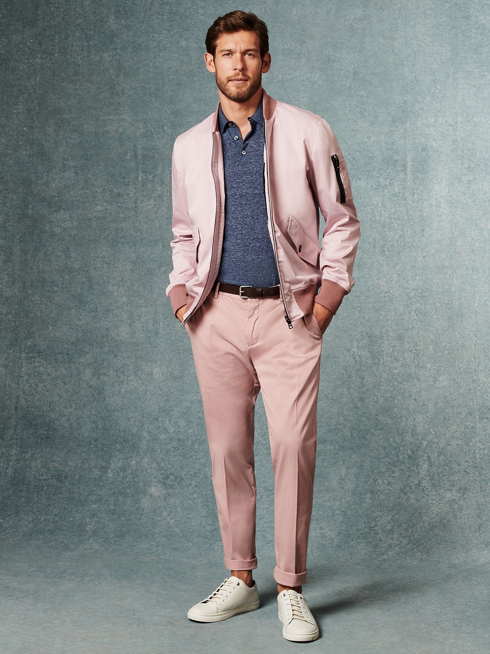 Iconic styles are given a fresh twist with the fashion-forward pink chino and satin bomber, and sky-blue fine-striped short suit.